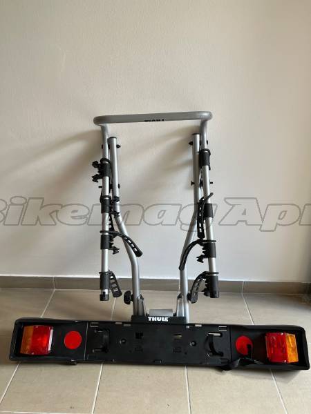 Thule vonóhorogra szerelhető 4-es kerékpártartó és rendszámtartó kábelekkel.
