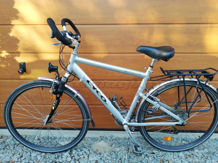 Eladó a képen látható Cyco német gyártmányú alu trekking/városi kerékpár. Felszereltsége: 51 cm vázméret, 28"-s kerekek, italtartó, elöl-hátul sárvédők, elöl-hátul lámpa dinamóval, teleszkóp, első leszedhető kosár, hátsó fix masszív csomagtartó, kényelmes ülés, Shimano Deore hátsó váltó, 24 sebességes első váltó, kényelmes kormány.
