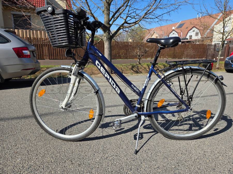 Használt, de jó állapotban lévő, Gepida Alboin 200 Pro női, 28”-as kerékméretű, kék színű trekking kerékpár első tulajdonostól eladó. A kerékpár Shimano váltóval (3x7), első teleszkópos rugózással, oldaltámasszal, kulacstartóval, kosártartóval és levehető kosárral rendelkezik. A kerékpár keveset volt használva. A kerékpáron a világítás nem működik, illetve a hátsó gumibelső lassú defektes, ezért a kerékpárhoz 1 db vadonatúj gumibelsőt adok grátisz. Ezeket leszámítva a kerékpár teljes mértékben működőképes, a váltó, a fékek, a hajtás hibátlanul működnek. A használatból eredő kisebb, a működést nem befolyásoló karcok, kopások láthatók a vázon.