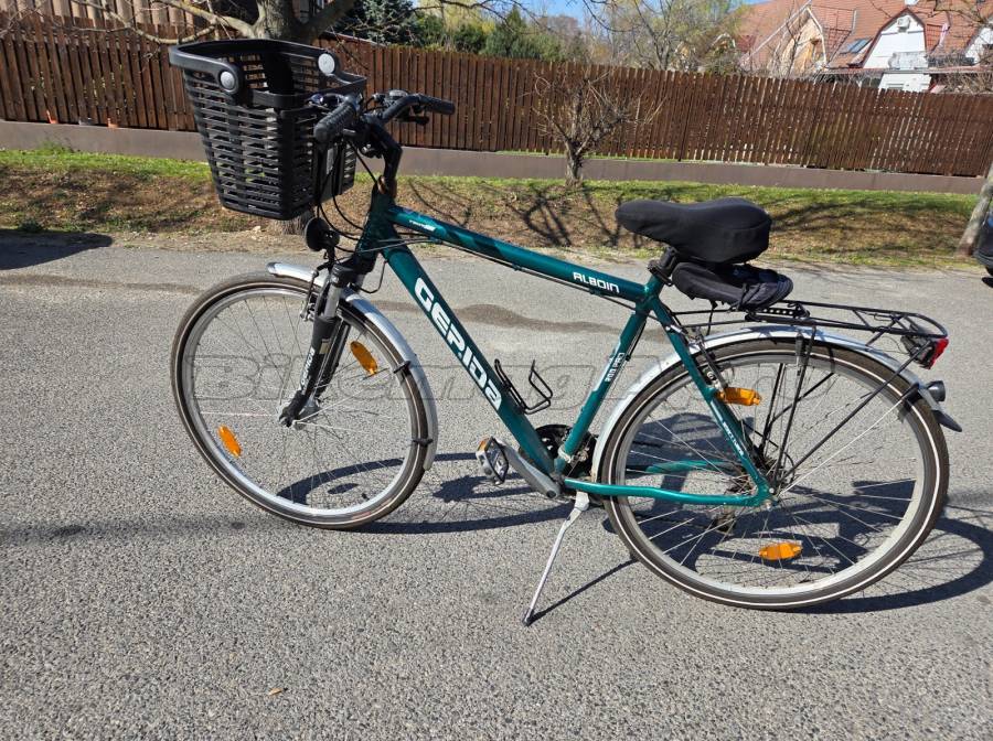 Használt, de jó állapotban lévő, Gepida Alboin 200 Pro férfi, 28”-as kerékméretű, zöld színű trekking kerékpár első tulajdonostól eladó. A kerékpár Shimano váltóval (3x7), első teleszkópos rugózással, oldaltámasszal, kulacstartóval, kosártartóval és levehető kosárral, továbbá a nyereg alá/mögé szerelhető zipzáras tárolózsebbel rendelkezik. A kerékpáron a világítás nem működik. Ezt leszámítva a kerékpár teljes mértékben működőképes, a váltó, a fékek, a hajtás hibátlanul működnek. A használatból eredő kisebb, a működést nem befolyásoló karcok, kopások láthatók a vázon.