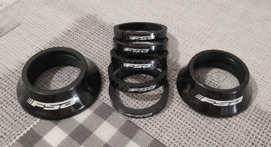 FSA karbon villanyak hézagoló szett. Használt, új állapotú! 28.6-os villanyakhoz. A szett tartalma: 5db 5mm-es gyűrű és 1db 15mm-es csapágy lezáró gyűrű. A csapágy lezáróból választható 45mm vagy 48mm átmérőjű. Foxpost előre utalás után vagy személyesen átvehető Székesfehérváron.