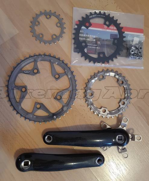 FSA karbon hajtómű szett, újszerű! Négyszögtengelyes, három lánctányérosra is építhető (Shimano 22t, 32t, 44t). Van hozzá egy vadonatúj fekete 34t alu lánckerék amivel egytányérosnak is építhető.