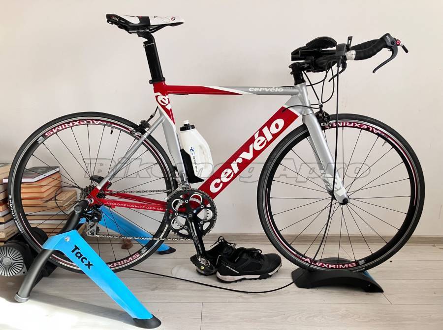 • Állapot: A kerékpár szobában, görgőn is volt használva (lásd a Tacx kiegészítőt a képeken), rendszeresen karbantartott. Esztétikailag a nyergen látható használati nyom, de a váz és a technikai alkatrészek kiváló állapotban vannak.